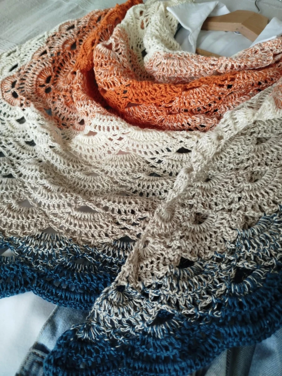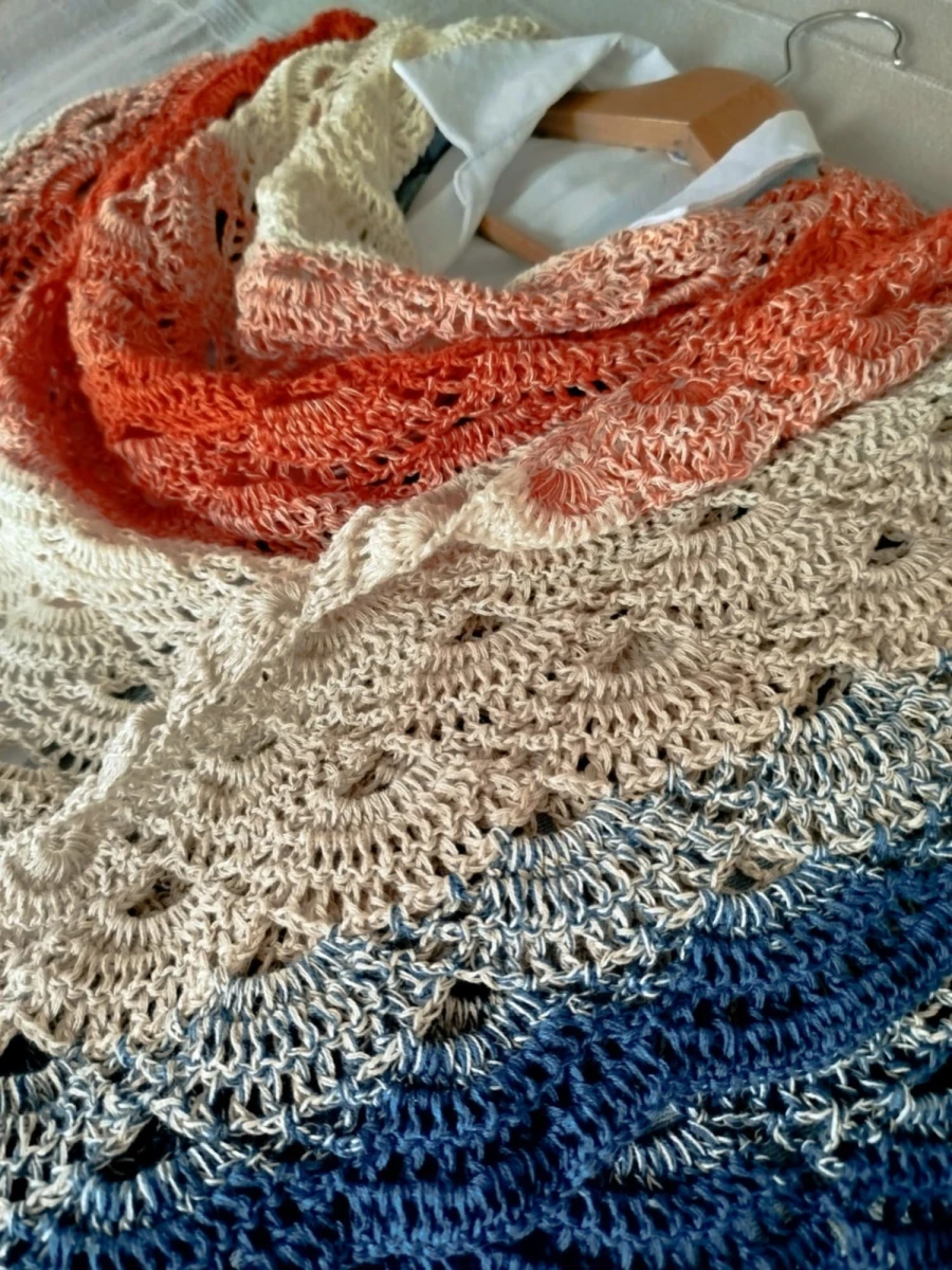 Została wykonana ręcznie na szydełku, w jednym egzemplarzu z bawełnianej włóczki w kolorach przechodzących łagodnie jeden w drugi (ombre).