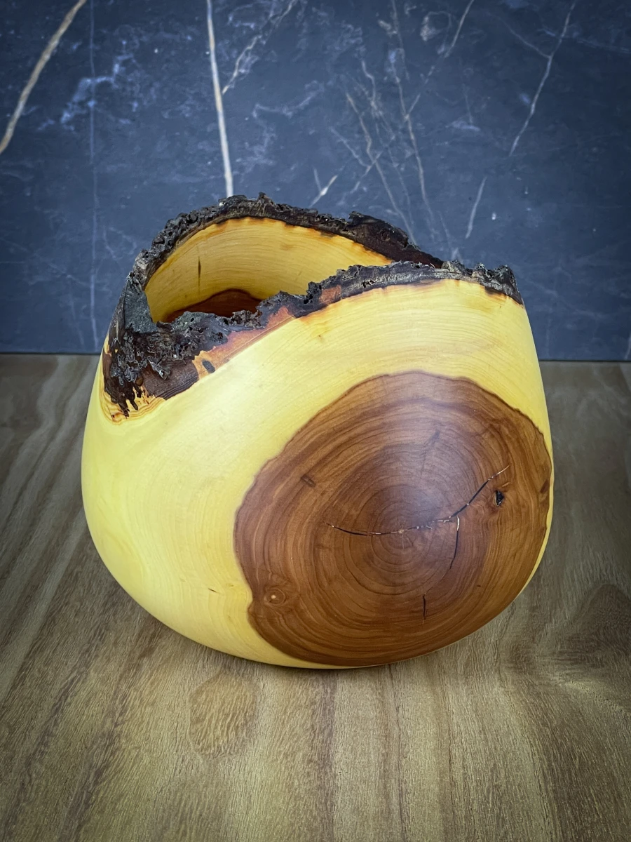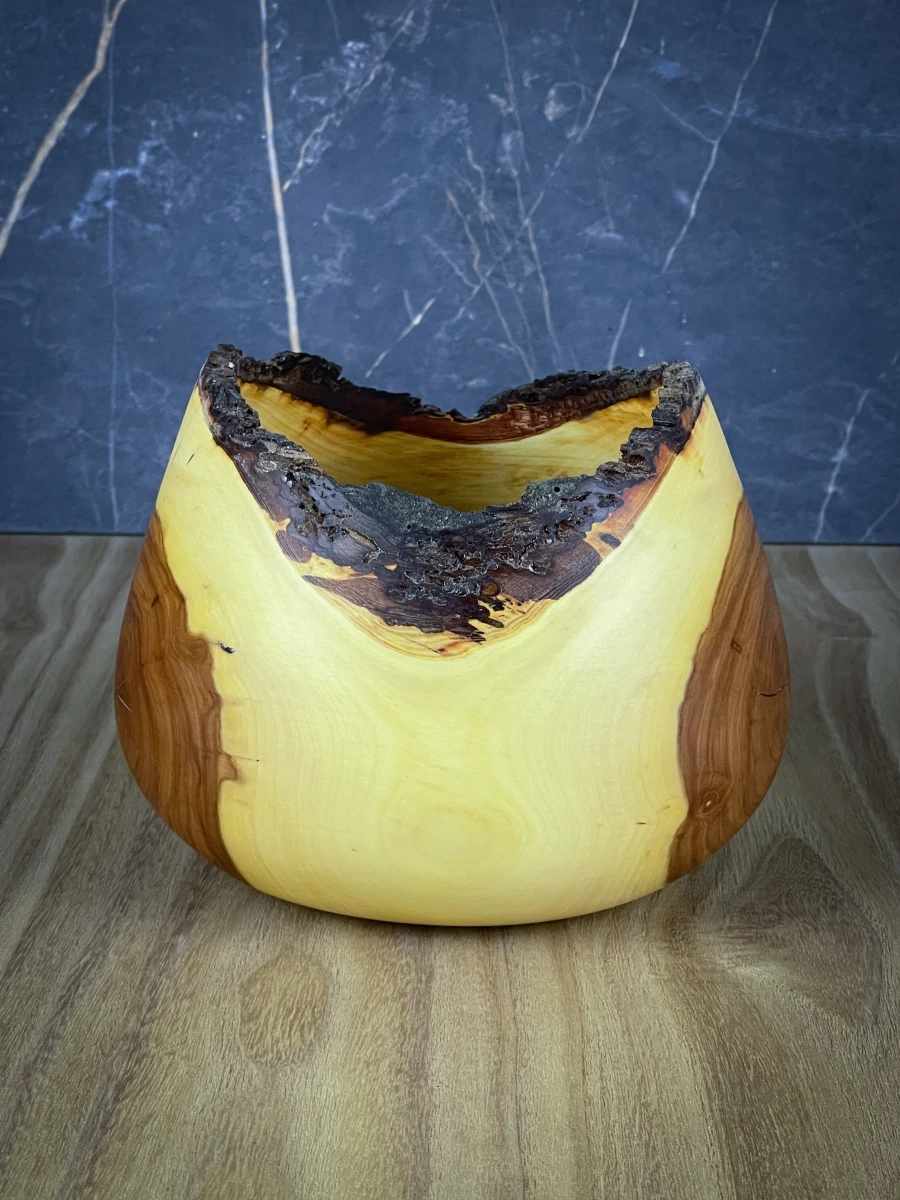Piękna głęboka jabłoniowa miska. Dwukolorowość to naturalny efekt powstały w wyniku przyrostu drzewa. Natomiast pozostawienie kory dodaje misce charteru i niepowtarzalności.