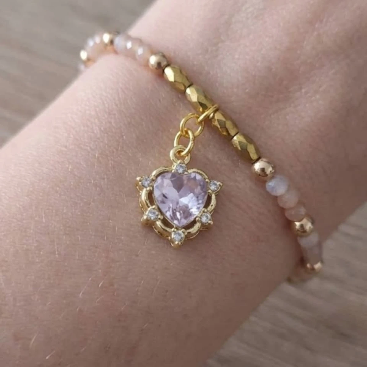 Sprzedam wyjątkową, ręcznie wykonaną bransoletkę, która łączy ciepły blask kamieni naturalnych z eleganckim złotem. Bransoletka jest niezwykle subtelna, rozświetla nadgarstek i pasuje do każdej stylizacji – od codziennej po elegancką. Materiały: * Kamień Słoneczny: Naturalne minerały w odcieniach pudrowego różu i beżu, które delikatnie mienią się w słońcu. Złoty Hematyt: Metaliczne przekładki wykonane z fasetowanego hematytu, które dodają biżuterii luksusowego charakteru. Zawieszka: Urocze, ażurowe serce w kolorze złotym z cyrkonią, które pięknie odbija światło. Konstrukcja: Wykonana na mocnej gumce jubilerskiej – pasuje na standardowy damski nadgarstek (ok. 15-17 cm). Stan: Nowa, idealna na prezent! Kamień słoneczny nazywany jest kamieniem optymizmu i dobrej energii. To idealny dodatek dla kobiet ceniących naturalność i romantyczny sty