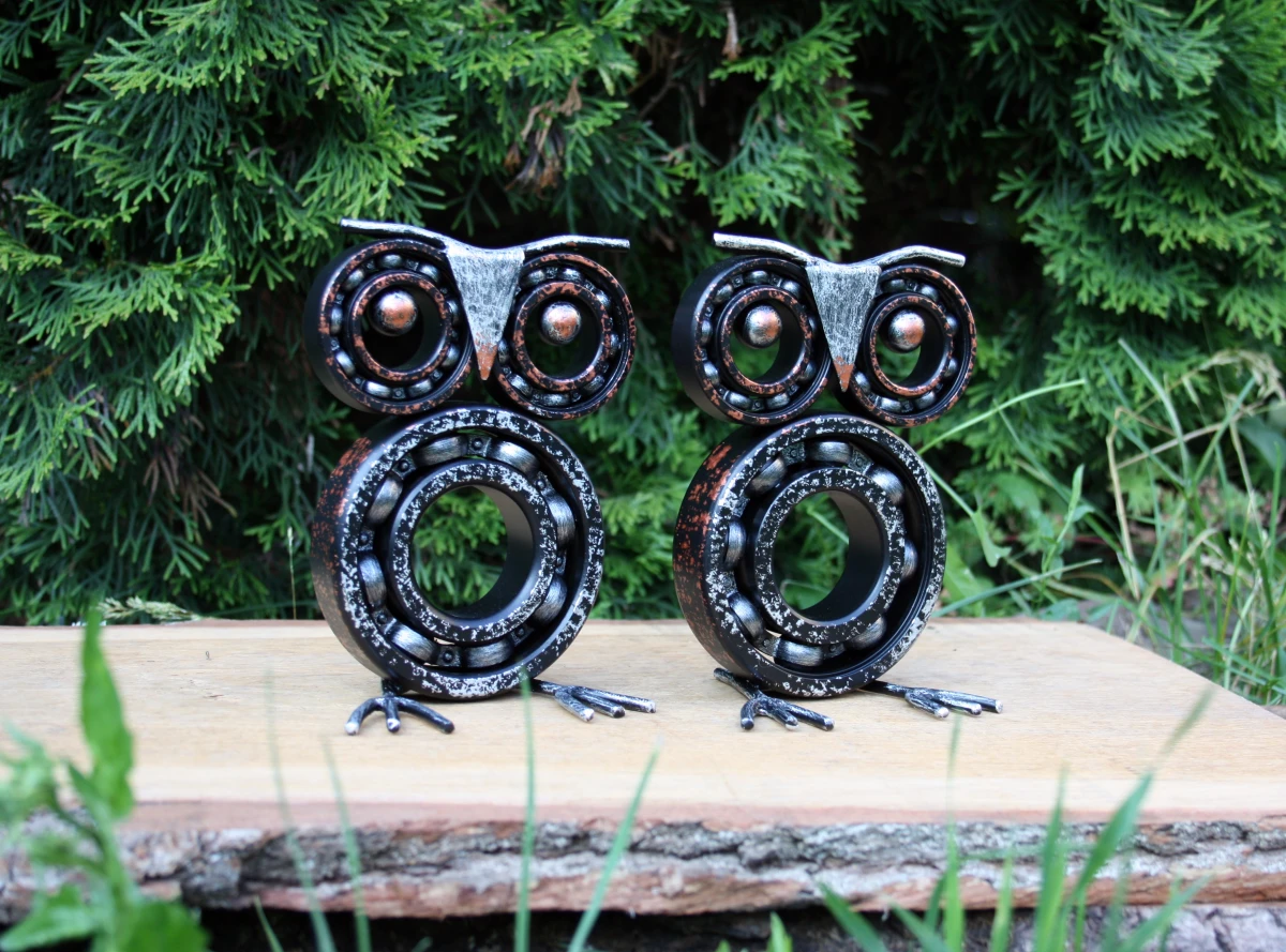 Witam tym razem figurka sowy z części mechanicznych (łożysk) oraz skrawków metalowego druta i blachy. Całość pokryta czarnym podkładem i patynami w kolorze srebrnym i miedzianym. Wysokość figurki to około 15 cm szerokość 10 cm