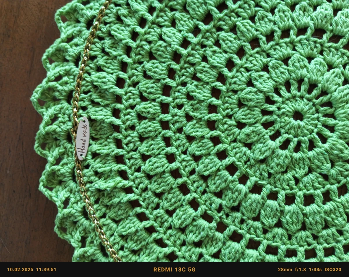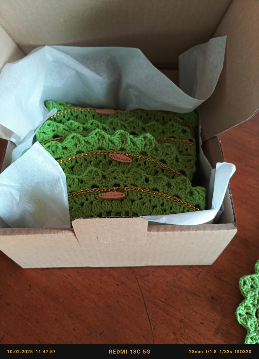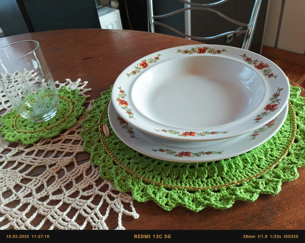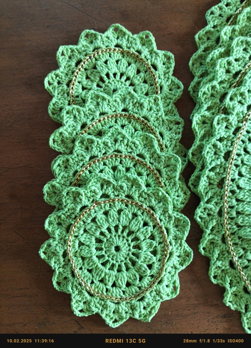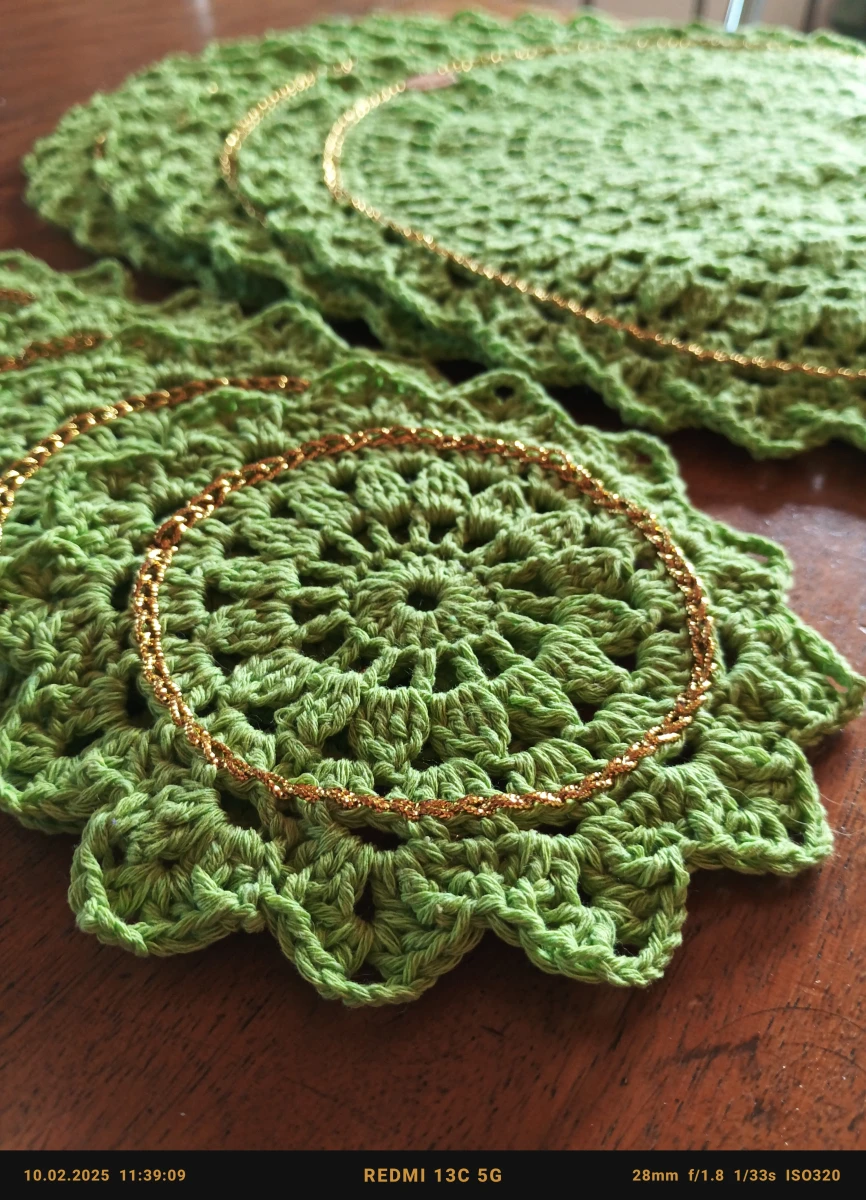 Cudowny 4 osobowy zestaw podkładek pod talerze i kubki. Średnica 34 i 14 cm. Wykonane z bawełnianej włóczki w kolorze soczystej zieleni z delikatnym dodatkiem złotej nitki. Będzie piękną ozdobą stołu przy posiłkach