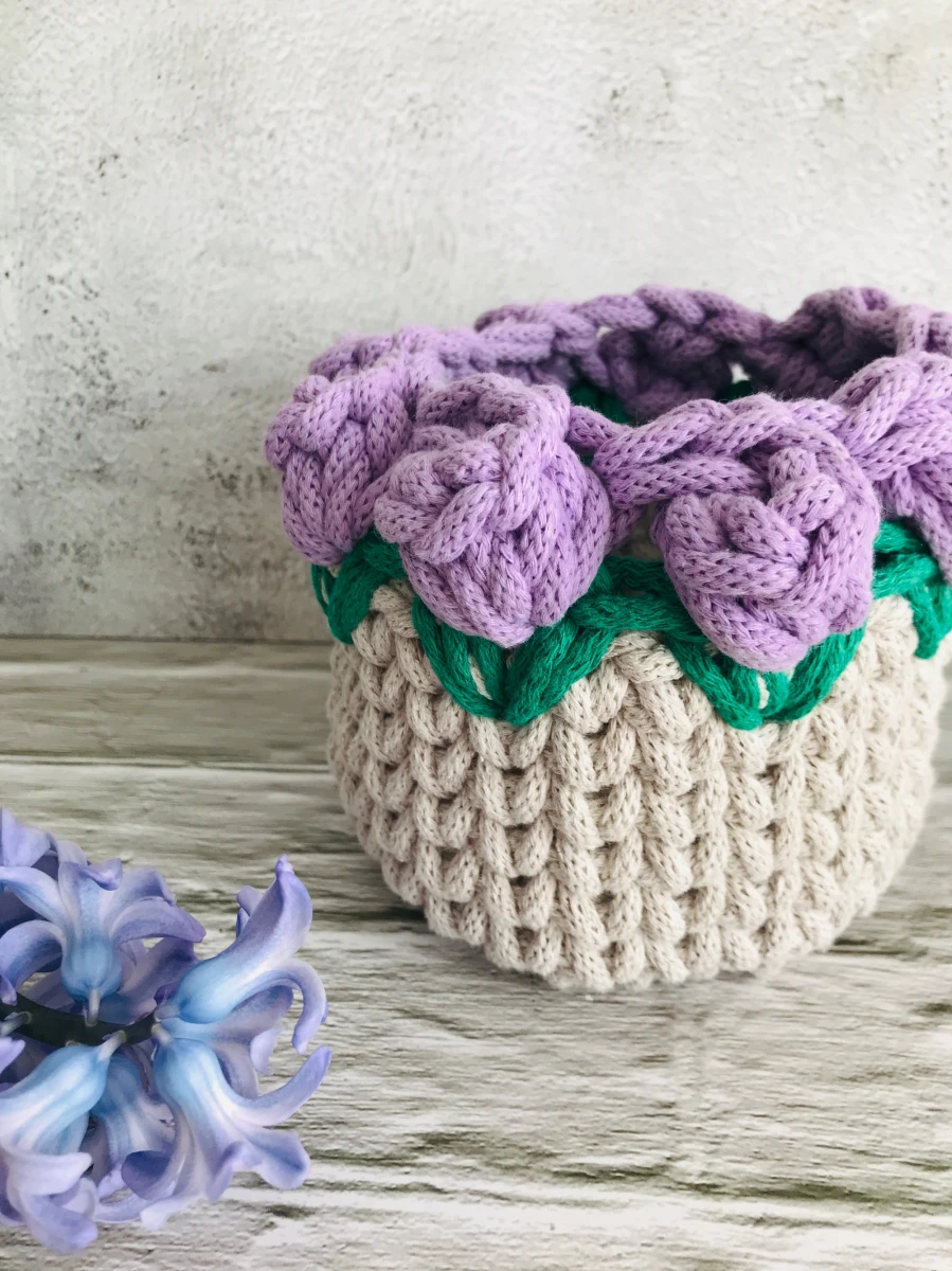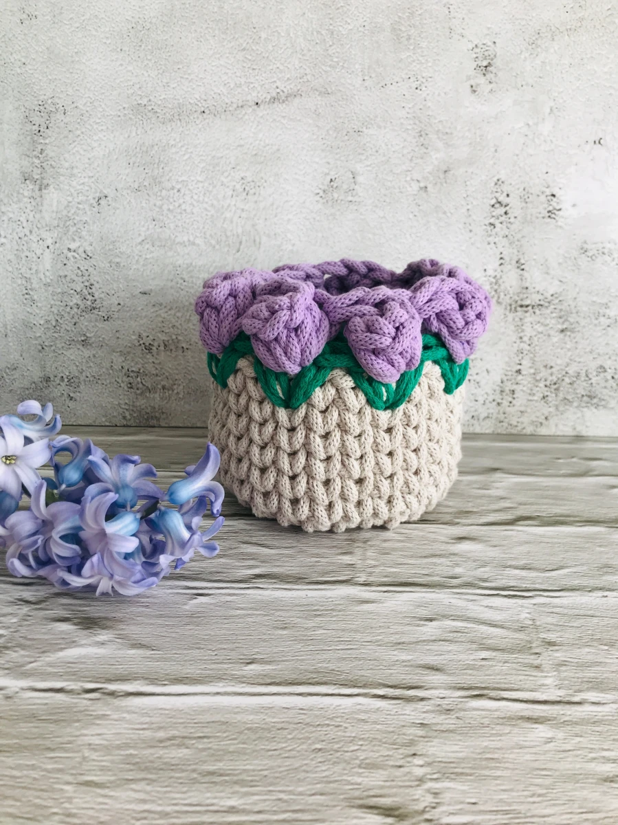 wykonany na szydełku z sznurka bawełnianego 5mm w kolorze j.beż w fioletowe tulipanki