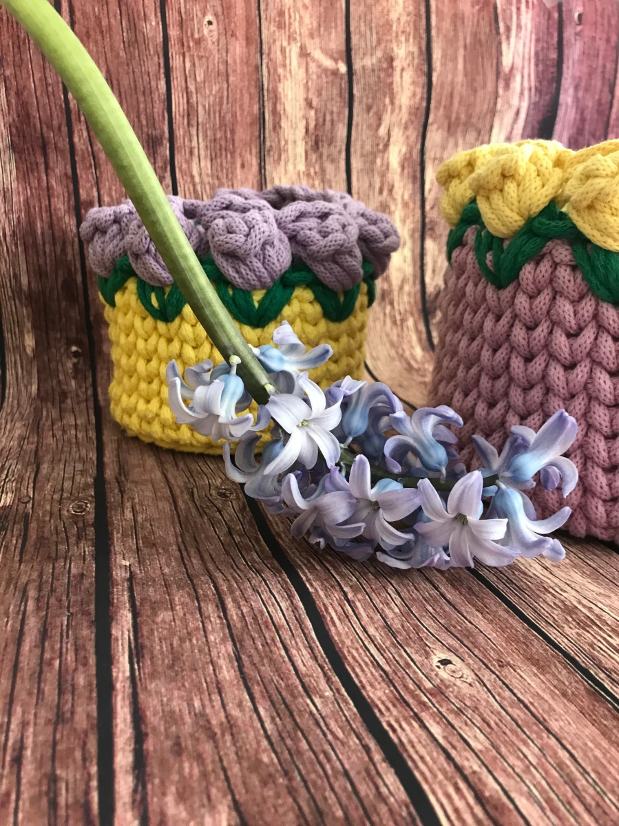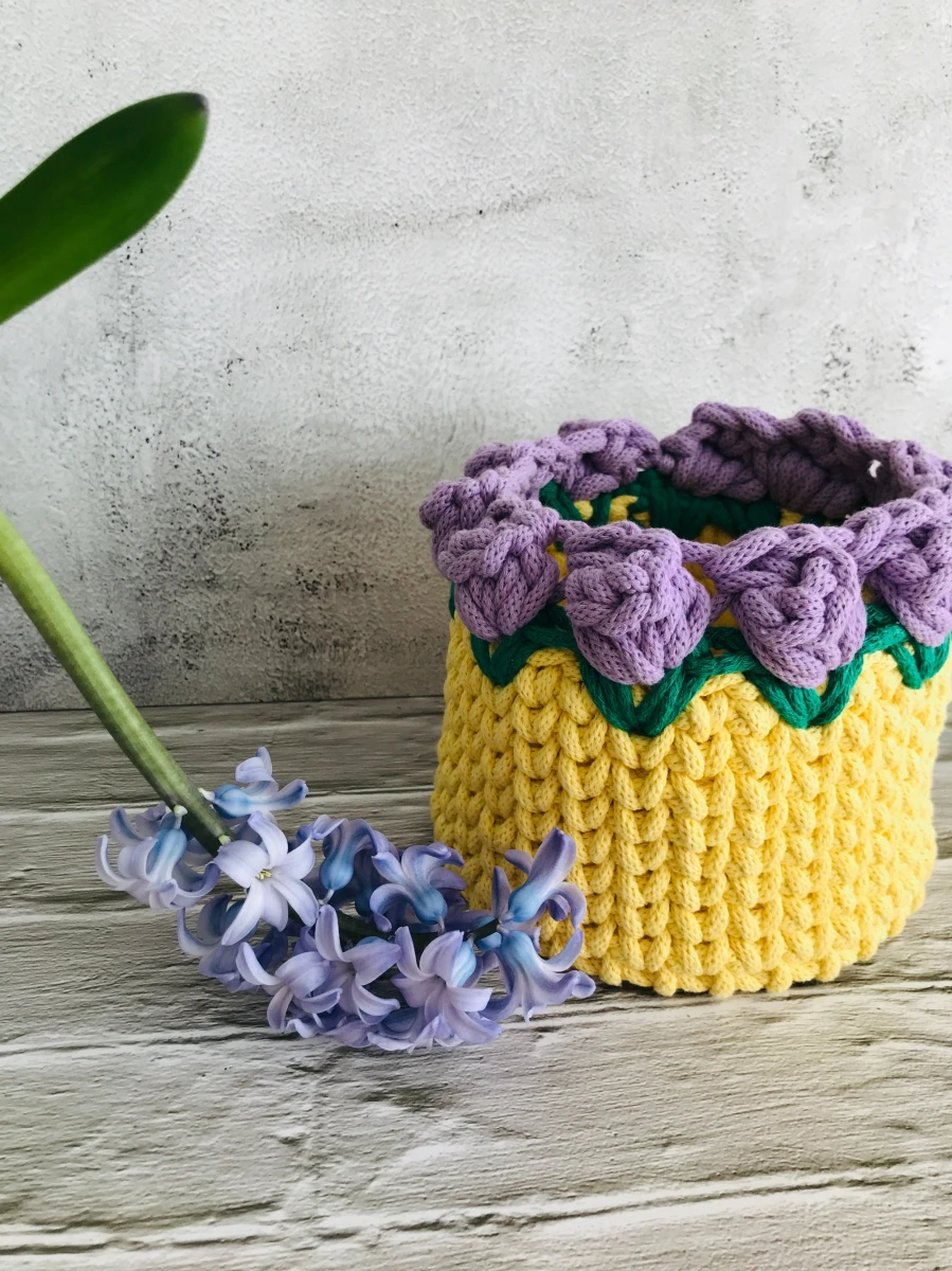 wykonany na szydełku z sznurka bawełnianego 5mm w kolorze pastelowym żółtym w fioletowe tulipanki
