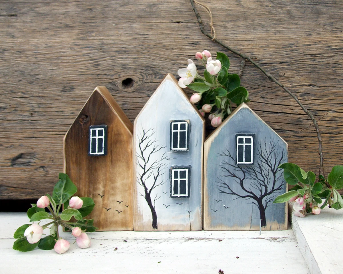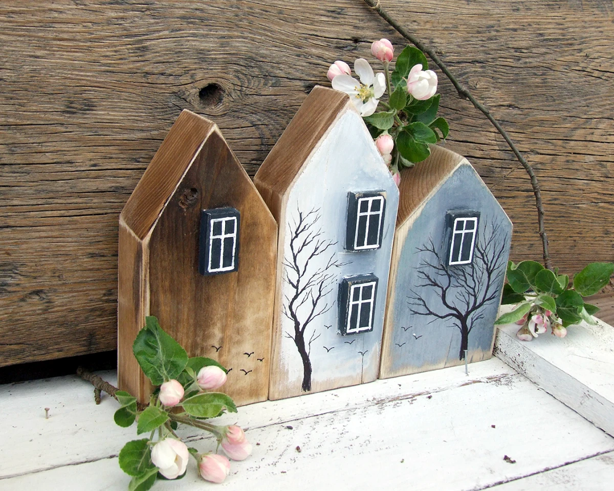 Zestaw 3 domków z drewna sosnowego - można je dowolnie przestawiać, ustawiać razem lub osobno. Pięknie wyglądają wśród kwiatów na parapecie, oryginalnie na półce z książkami, klimatycznie na kominku.