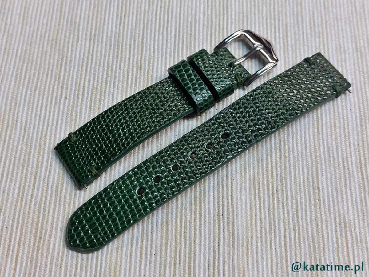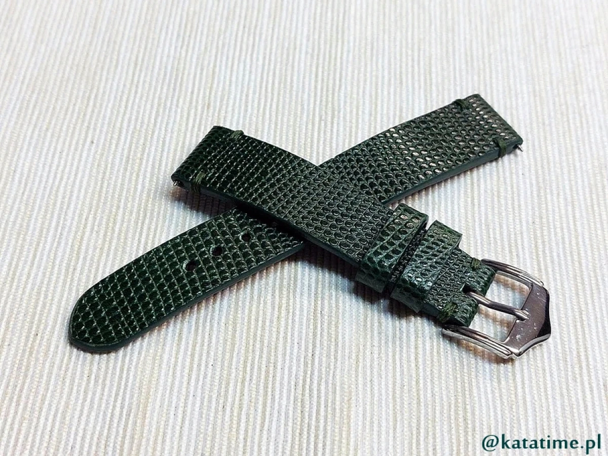 Spód paska wykonany jest także z naturalnej skóry w kolorze czarnym. Boki są lakierowane, w kolorze zielonym. Minimalne, prawie niewidoczne szycie przy teleskopach. Klamra stalowa, polerowana, w lekko witydżowym stylu.