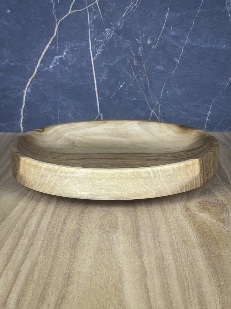 Prosta patera z drewna orzechowego. Krawędź boczna poprowadzona w lini prostej, środek z lekkim wgłębieniem. Patera naturalnie dwukolorowa dzięki przepięknemu usłojeniu.