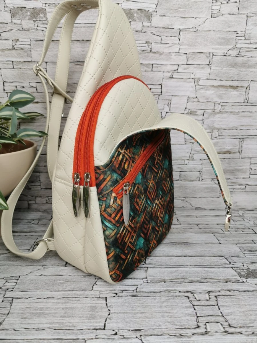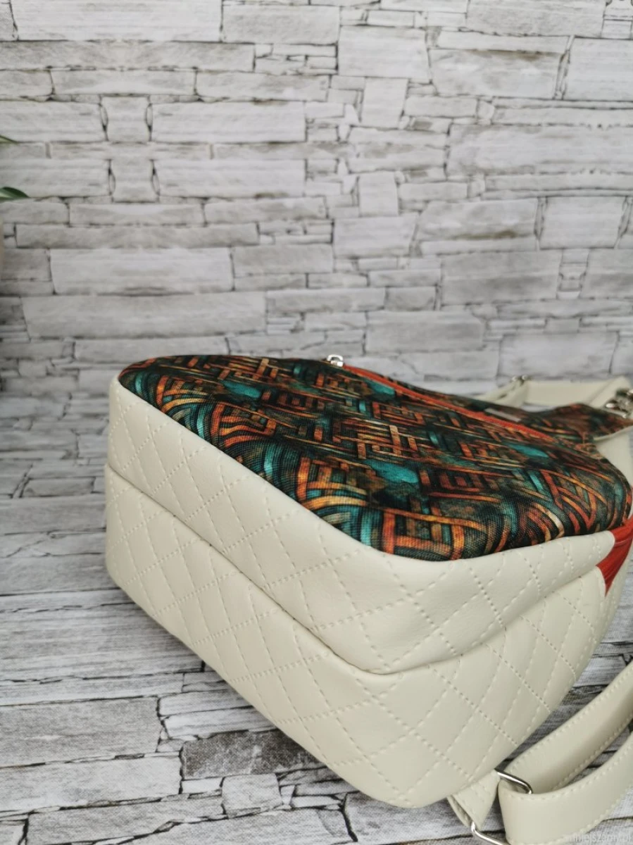 Jest to plecak dwukomorowy z oddzielną wsuwaną kieszenią z przodu . Na tej kieszeni znajduje się dodatkowa pojemna kieszonka na zamek . Plecak został uszyty z pikowanej ekoskóry w kolorze ecru , w połączeniu z tkaniną poliestrową ( przód plecaka ) . Wnętrze plecaka to podszewka poliestrowa wodoodporna w kolorze jasno turkusowym . Szelki regulowane .
