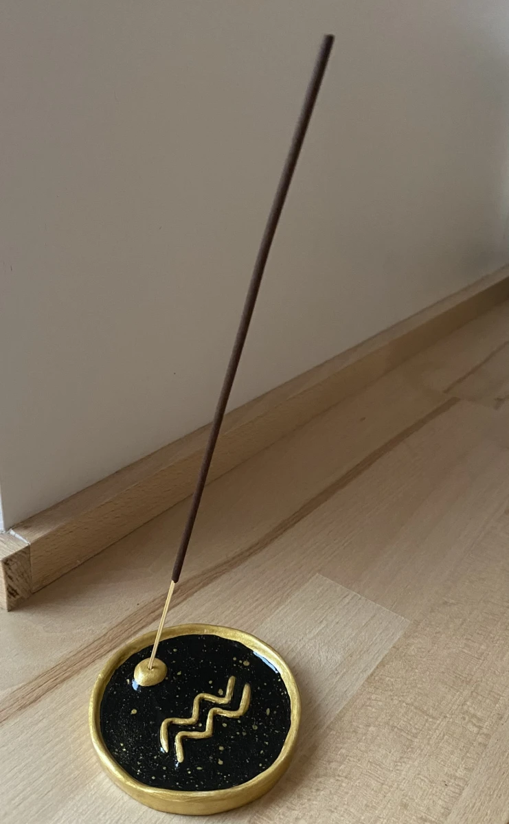 Własnoręcznie wykonana podstawka do kadzidełka z gliny samoutwardzalnej ze znakiem zodiaku WODNIK. Pomalowana farbami akrylowymi na czarno ze złotym zdobieniem. Zabezpieczona podwójną warstwą specjalnego werniksu z wysokim połyskiem oraz dodatkowo podwójną warstwą lakieru akrylowego, dającym szklące wykończenie :) Dzięki zabezpieczeniu podstawka jest bardziej odporna na czynniki zewnętrzne oraz jest prostsza do utrzymania (wystarczy przetrzeć delikatnie ściereczką w celu wyczyszczenia - czyścić na bieżąco).