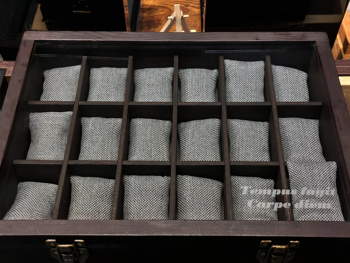 Ta skrzyneczka posłuży lata. Solidne zawiasy i zapięcie idealnie pasują do rustykalnego stylu całości. Kieszonki na zegarki są duże i głębokie, świetnie zabezpieczają zegarki przed uszkodzeniem oraz porysowaniem przez np. koronkę sąsiada, wygodnie zmieszczą się zegarki o szerokości nawet 55 mm! Szkło w wieczku skrzyneczki jest grube, hartowane dzięki czemu ma podniesioną odporność na stłuczenia i porysowanie. Warto popatrzeć na szczegóły wykonania. Dno skrzyneczki zostało wyklejone takim materiałem, z jakiego są uszyte poduszki. Pudełko na gumowe nóżki utrudniające ślizganie i zapobiegające rysuwaniu powierzchni, na którym stoi.