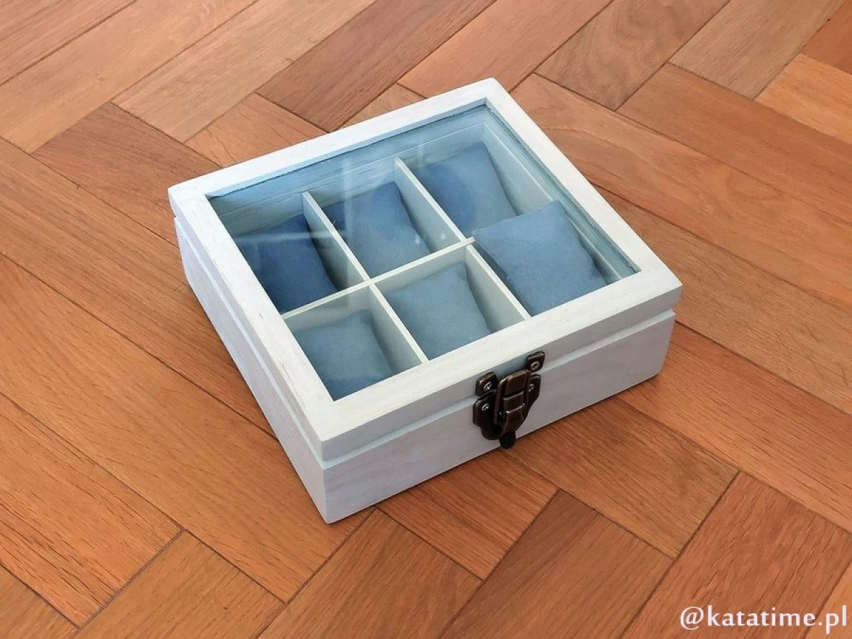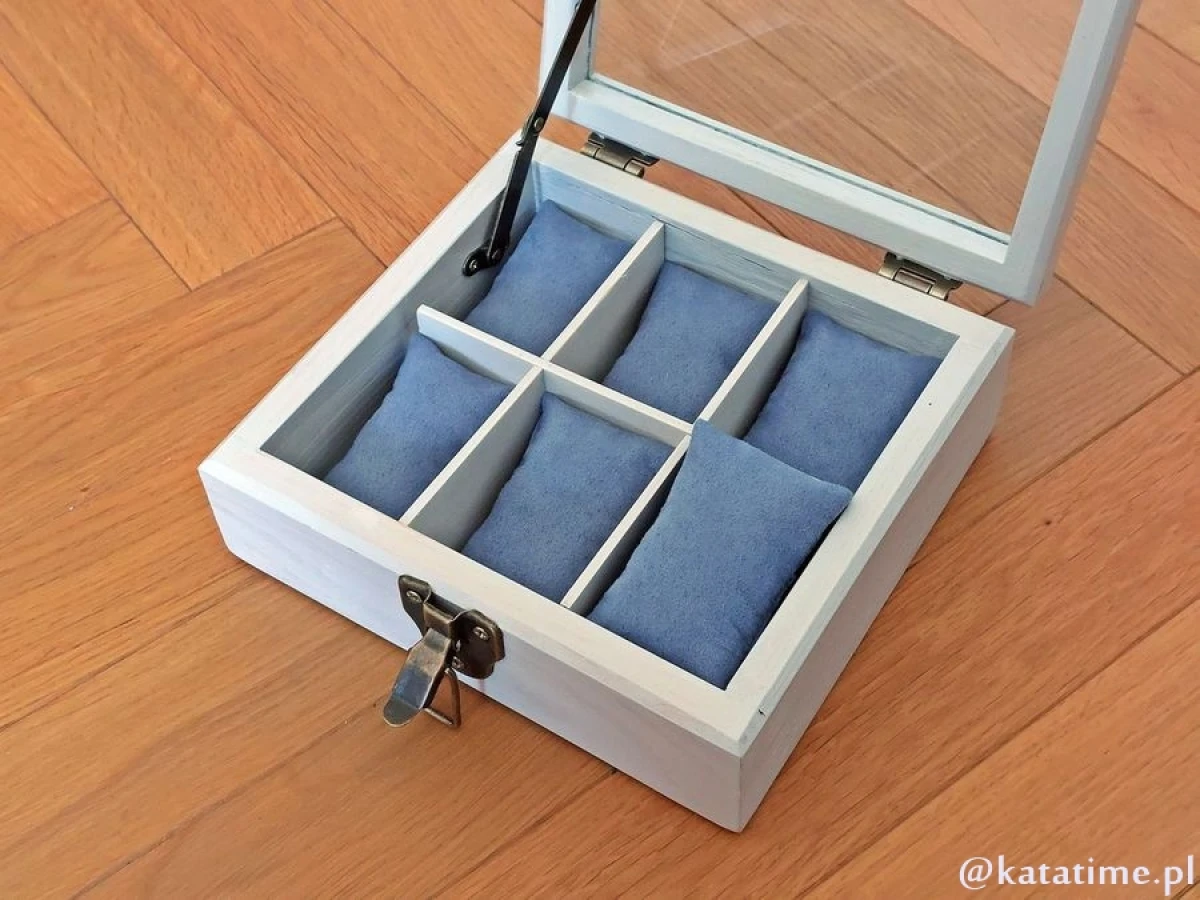 Ta skrzyneczka posłuży lata. Solidne zawiasy i zapięcie idealnie pasują do rustykalnego stylu całości. Kieszonki na zegarki są duże i głębokie, świetnie zabezpieczają zegarki przed uszkodzeniem oraz porysowaniem przez np. koronkę sąsiada, wygodnie zmieszczą się zegarki o szerokości nawet 50 mm! Szkło w wieczku skrzyneczki jest grube, hartowane dzięki czemu ma podniesioną odporność na stłuczenia i porysowanie. Warto popatrzeć na szczegóły wykonania. Pudełko jest podklejone filcem. Zastosowaliśmy także blokadę otwierania wieka skrzyneczki.