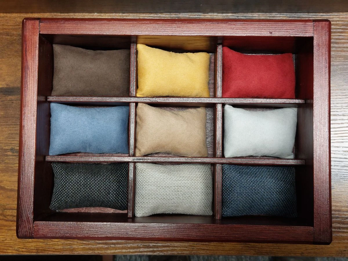 Poduszeczki są wykonane z mocnego, wytrzymałego materiału obiciowego (alcantara) o podwyższonej odporności na zabrudzenia i rozdarcia, w kolorze ciemnobłękitnym. Są elastyczne, dzięki czemu można na nich zapiąć zegarki w różnych rozmiarach, na paskach i bransoletach. Poduszeczki lubią się gubić, dlatego jedna jest dołożona dodatkowo.