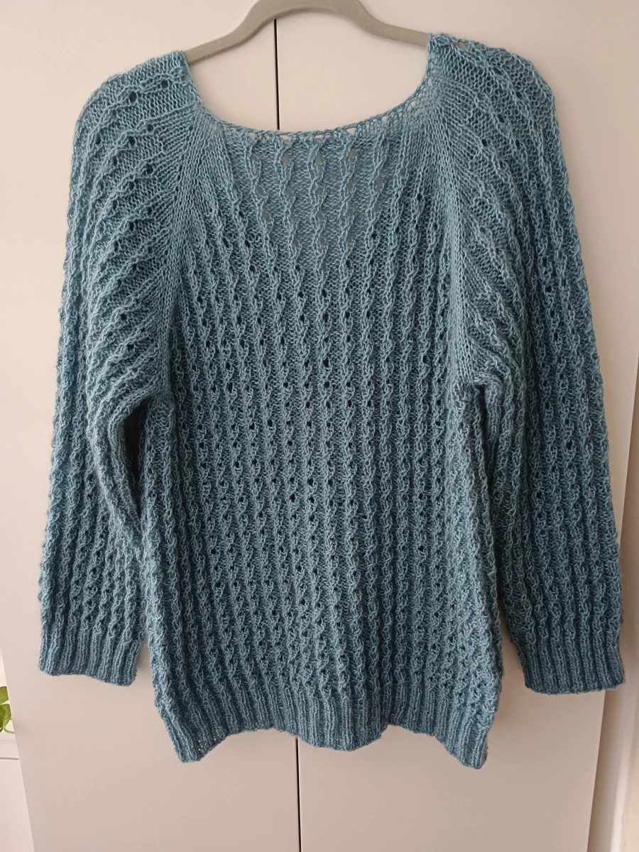 Sprzedam sweterek ręcznie zrobiony. Włóczka : kaszmir 58%, alpaka 37% plus nitka moheru. Bardzo miękki i miły. Kolor zgaszony turkus. Szerokość pod pachami 52 cm, długość 65 cm. Długość rękawa 65 cm. Podane wymiary, to wymiary mierzone na płasko. Sweterek pasuje od rozmiaru M do XL.