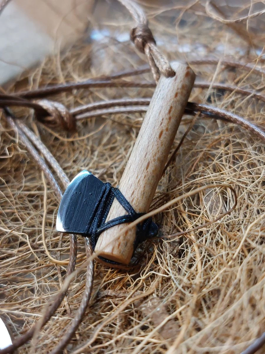 Ręcznie wykonany męski lub damski wisiorek ze stali nierdzewnej, na brązowym, plecionym sznureczku. Każdy nożyk i toporek jest wykonany w jednym, czasem dwóch, niepowtarzalnych egzemplarzach.